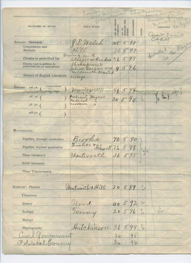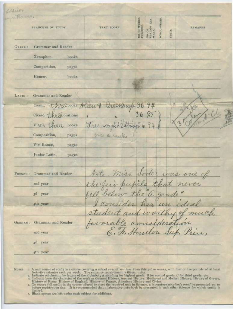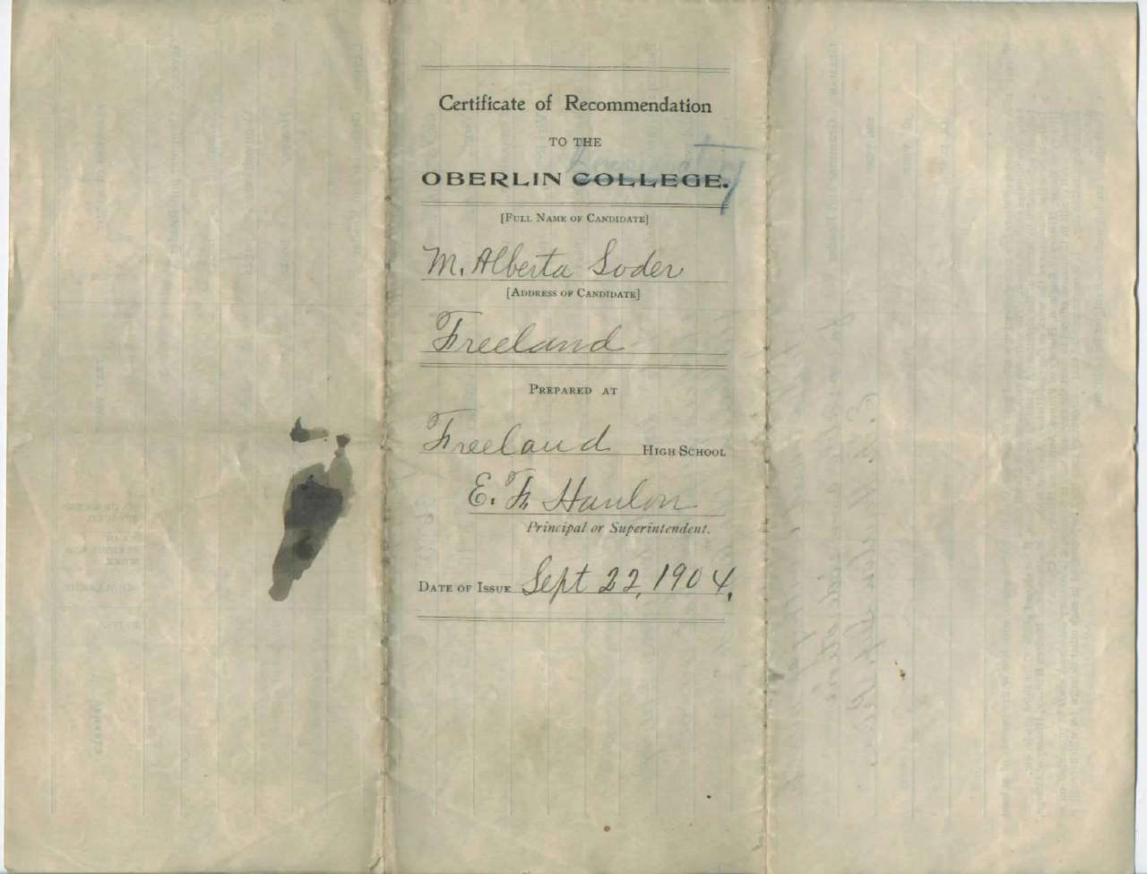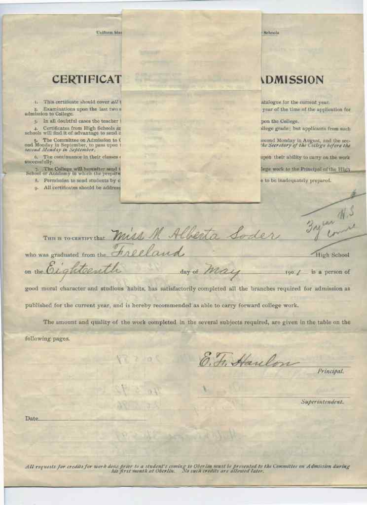 These images are Alberta Soder's application to Oberlin. The bottom page is a repeat of page 1 with the pasted grade sheet lifted.
