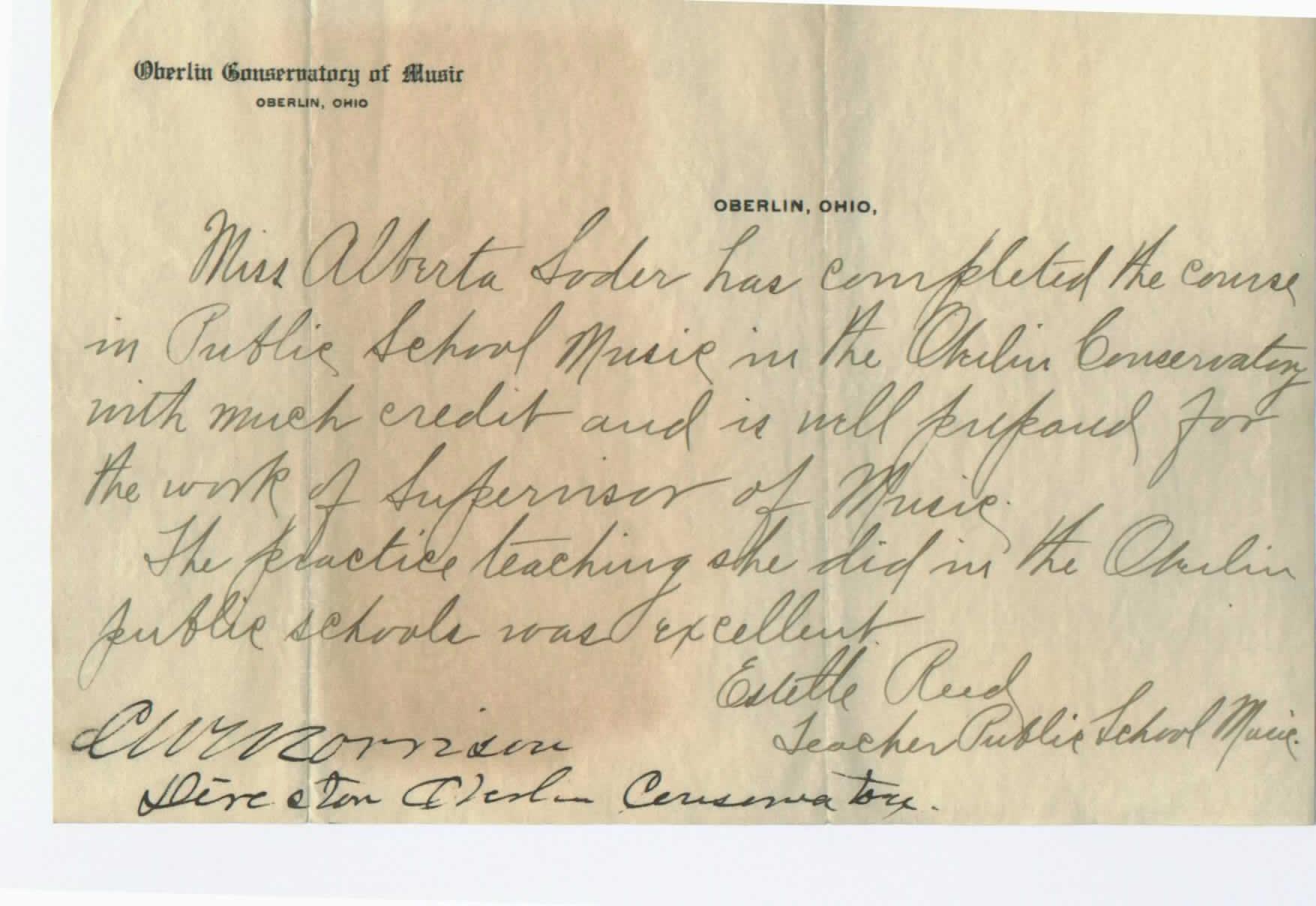 This is a letter of reference for Alberta Soder. Date is unkown, but